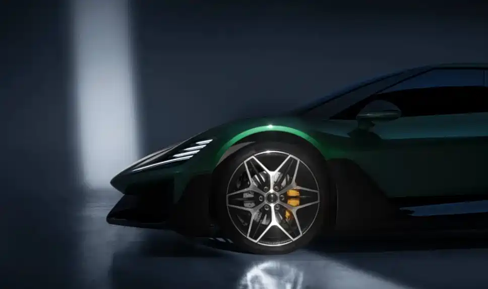从图中可以看出,新车定位超级跑车,当然是一款纯电车。它的车身结构非常修长,前后翼子板还采用了隆起的设计,给人的感觉非常有力量感。轮圈则是六辐式花瓣轮圈,以及中央螺栓缩结构,预计将会配备碳陶制动系统。另外新车的侧面还有两个看点,一个是大尺寸的侧翼端板设计,另一个则是隐藏式A柱设计。